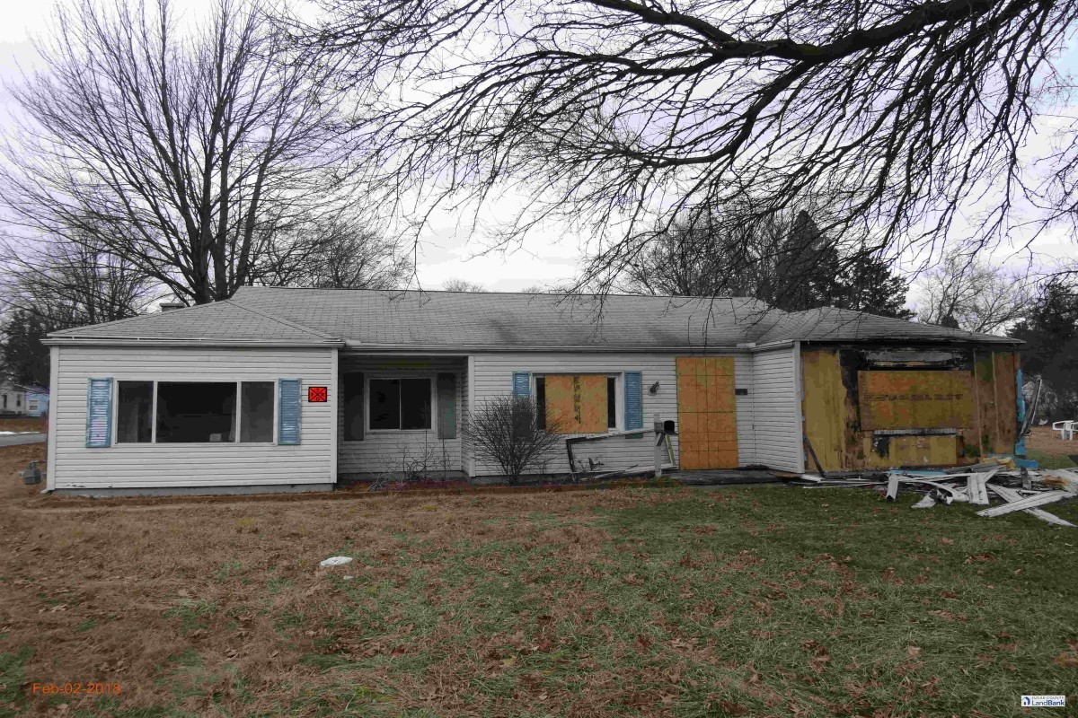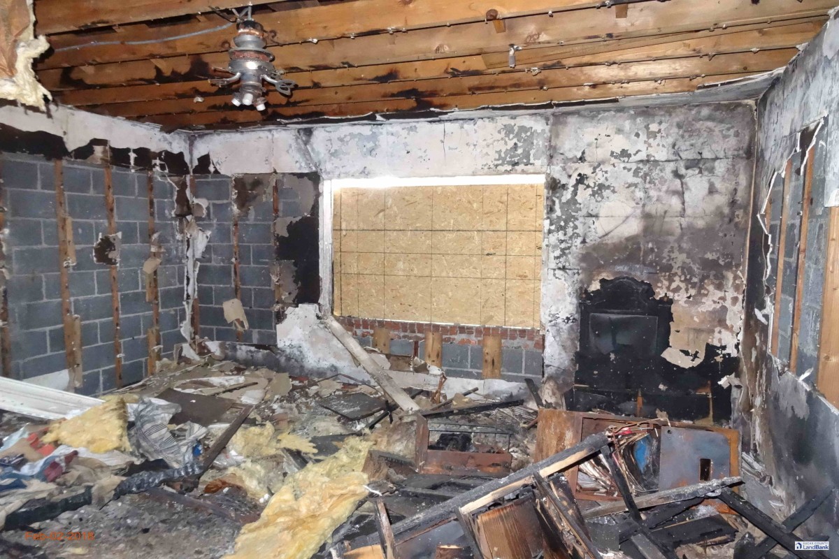 When the Land Bank acquired 4758 Violet in the Franklin Park neighborhood following tax foreclosure, it was a shell of its former self. The outside was boarded, smoke-charred, and flagged by the Fire Department as an emergency. The inside was so gutted that most of the rooms were no longer recognizable. After the fire, the owner simply walked away.